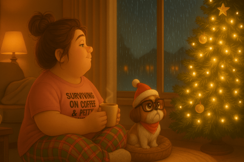 Our living room is small and simple, but when the tree lights up, it’s like someone pressed “cozy mode” on heaven’s remote. Rain outside, warm lights inside, hot cocoa in our paws and hands… I thought, Perfect. I’m going to sleep like the emotionally stable dog I am.