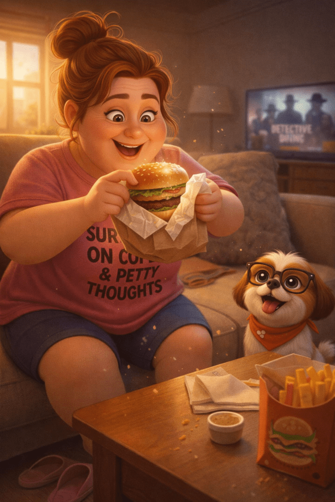 A burger + crime solving + emotional support dog + me silently thirsting over Rhys Halden.