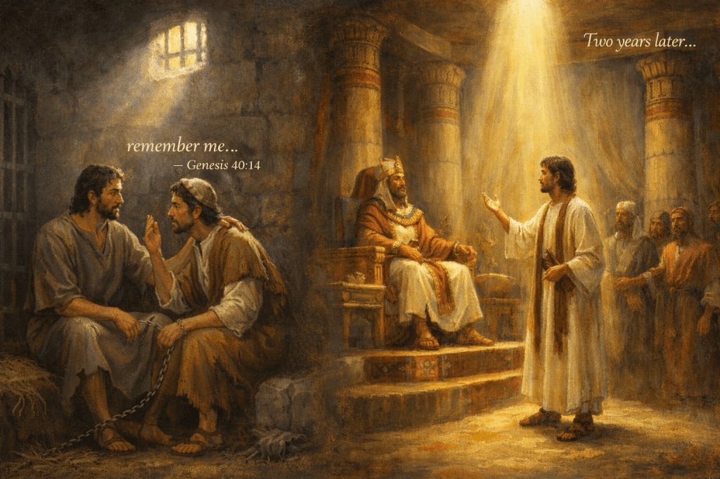 In prison, Joseph interpreted dreams for two of Pharaoh’s officials: the cupbearer and the baker. One would live, one would die. Joseph interpreted correctly, and before the cupbearer left he said, “When it goes well with you, remember me… mention me to Pharaoh.”