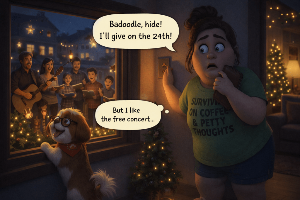 I’m standing on the windowsill, watching a small group of carolers outside our gate—with tambourines, guitars, and that one tito who sings slightly off-key but with full conviction. I bark at them, but it’s a good bark. The “please continue, I am being serenaded” bark.