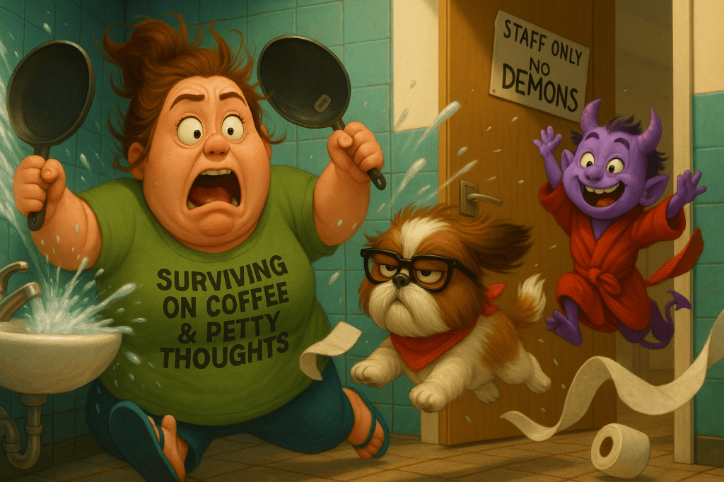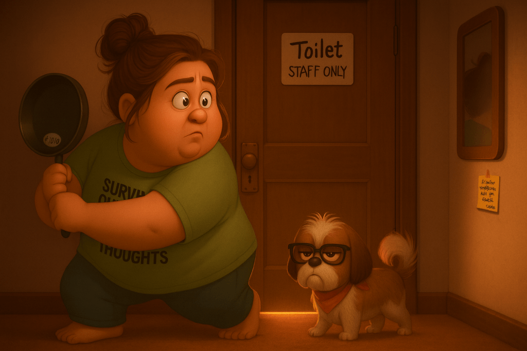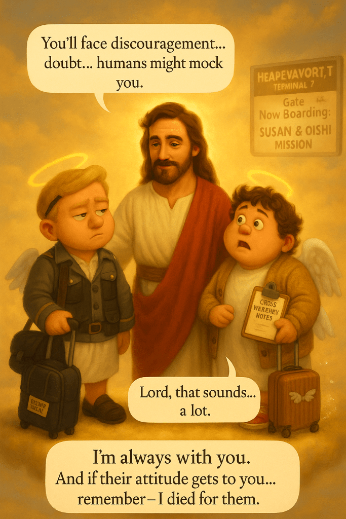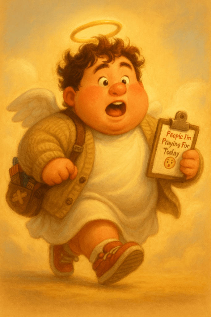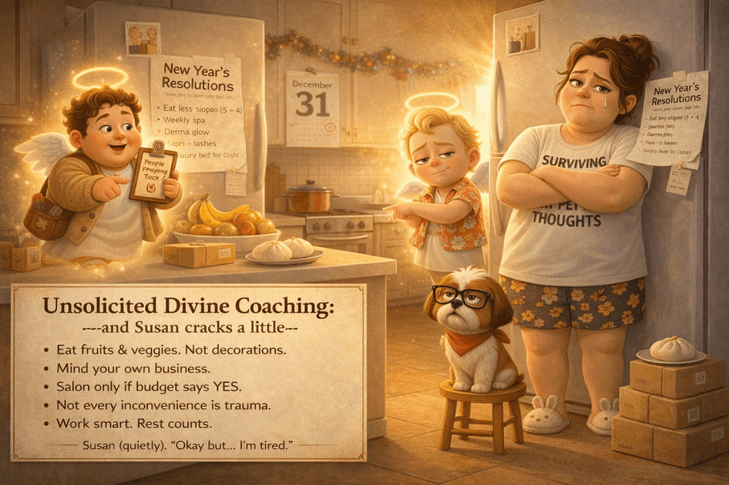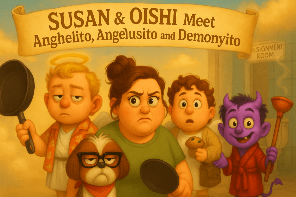 I was about to post this on the fridge like a manifesto, when Anghelito and Angelusito appeared. My personal heavenly CCTV duo. I sighed, sat down, and mumbled, âAlright, here comes the unsolicited divine coaching.â Oishi barked like he was in on it.
