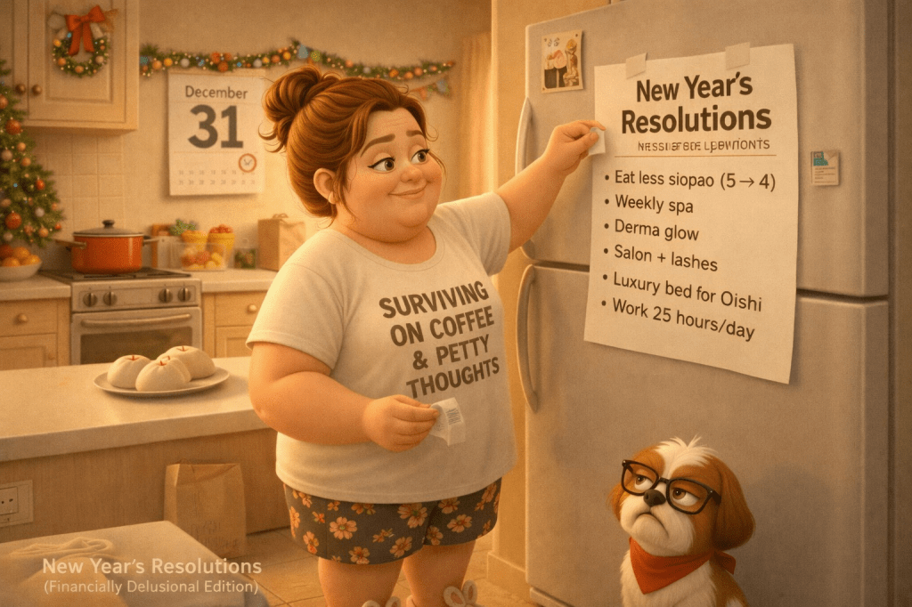 Now itâs New Yearâs Eve. Oishi and I are preparing to welcome the new yearâme, with a resolution list and reheated siopao; him, with a suspicious eye and a belly full of leftover ham.