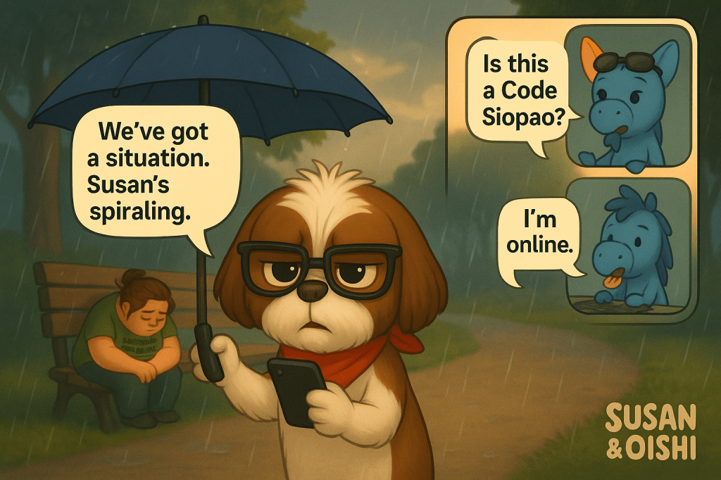 It was Thursday night, 8:53 PM, and Susan wasn’t home yet. Your local Philosufurr was panicking. I called Sashimi, our bark-comm specialist, and Bulgogi the chaos intern, to track her location. Was she in danger? At the hospital? Had the Siopao finally done her in?